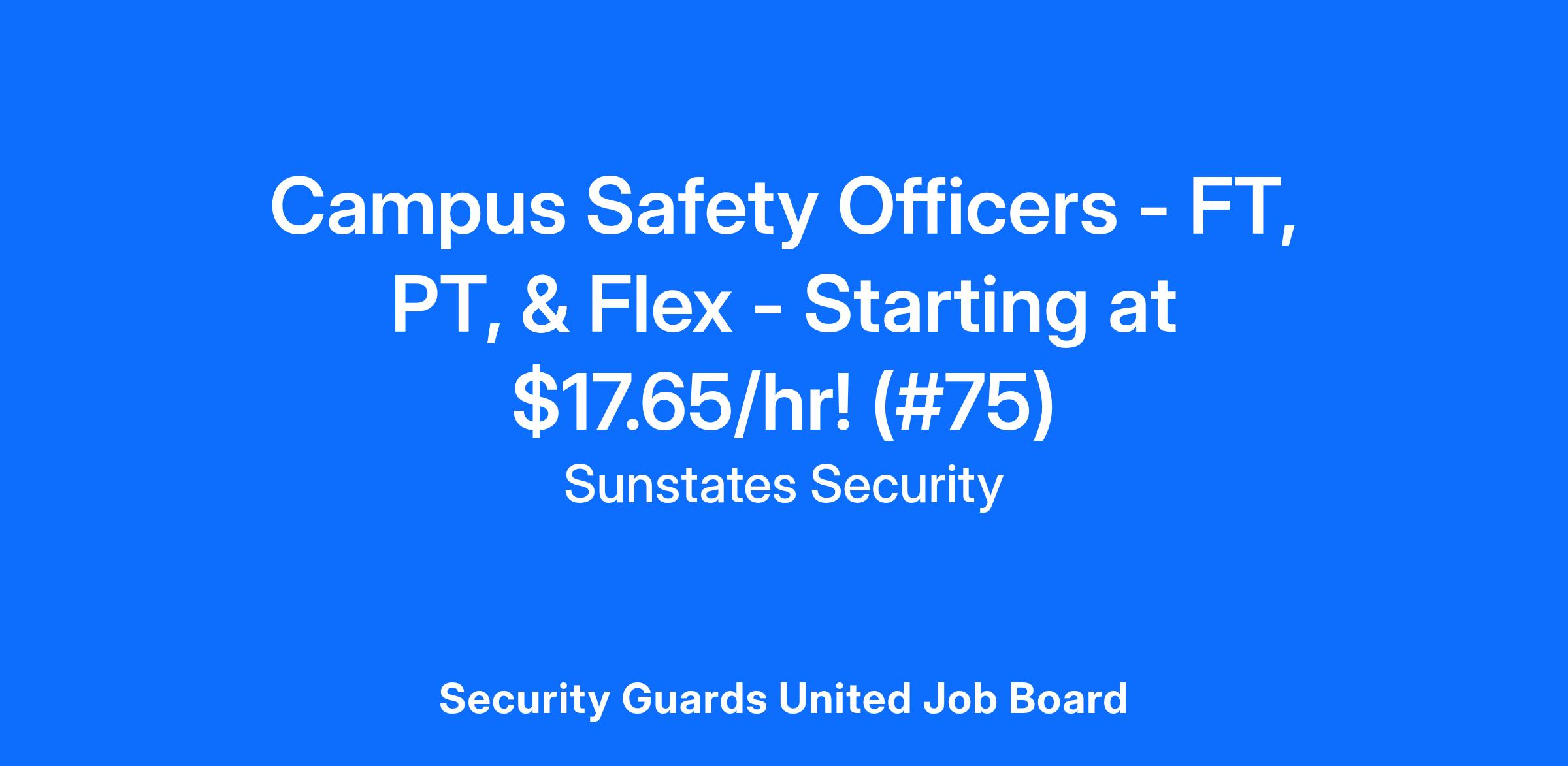 Sunstates Security is currently hiring full-time, part-time, and flex Campus Safety Officers in the Atlanta, GA area. These positions have a starting pay rate of $17.65/hr - with weekly pay. All shifts and days are available, including weekends.