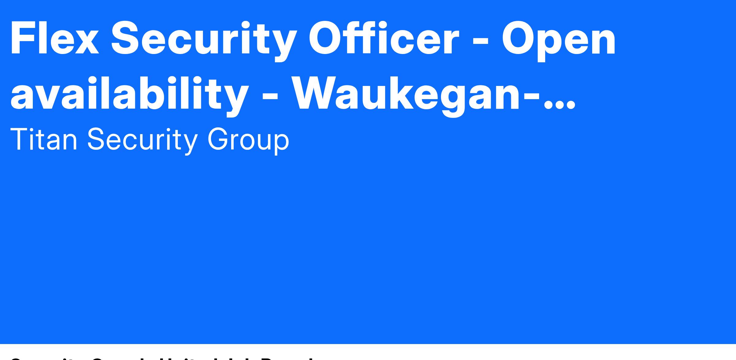 We are hiring immediately for Unarmed Security Officers to work as Flex Security Officers at various locations throughout the North and Northwest subburbs of Chicago. Ideal candidates will have availability for both 2nd and 3rd shift because schedules can and do change over time, and you will be needed to cover for call-offs or other issues. Titan will, however, make every effort to provide adequate notice of schedule changes.