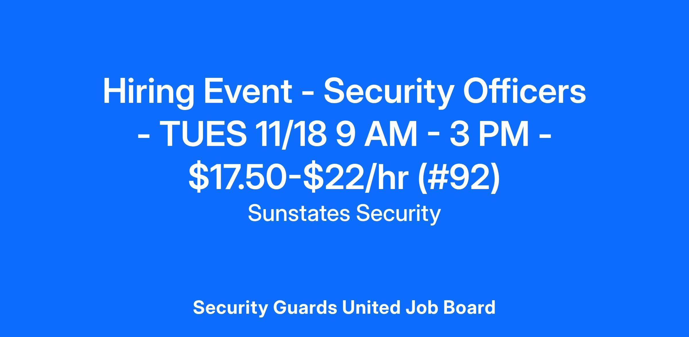 Sunstates Security is hosting a Hiring Event for Security Officers on Tuesday, November 18th, from 9:00 AM - 3:00 PM.