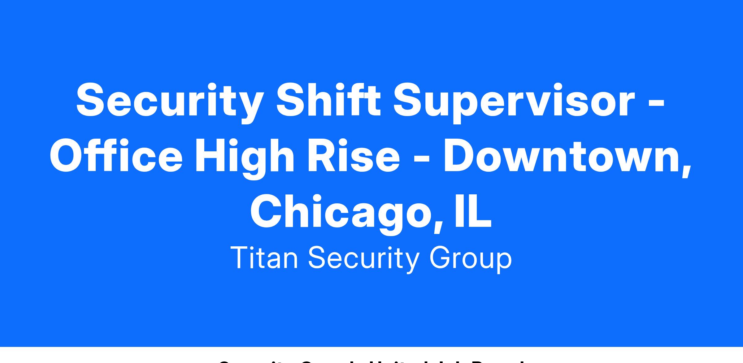 We are hiring non-union Security Shift Supervisors to work at several commercial office building in the Chicago Loop. Must have availability to work the 2nd Shift (3pm-11pm) and/or 3rd Shift (11pm-7am) and must be available to work weekends. ***MUST HAVE EXPERIENCE MANAGING A SECURITY TEAM IN A COMMERCIAL OFFICE BUILDING!***