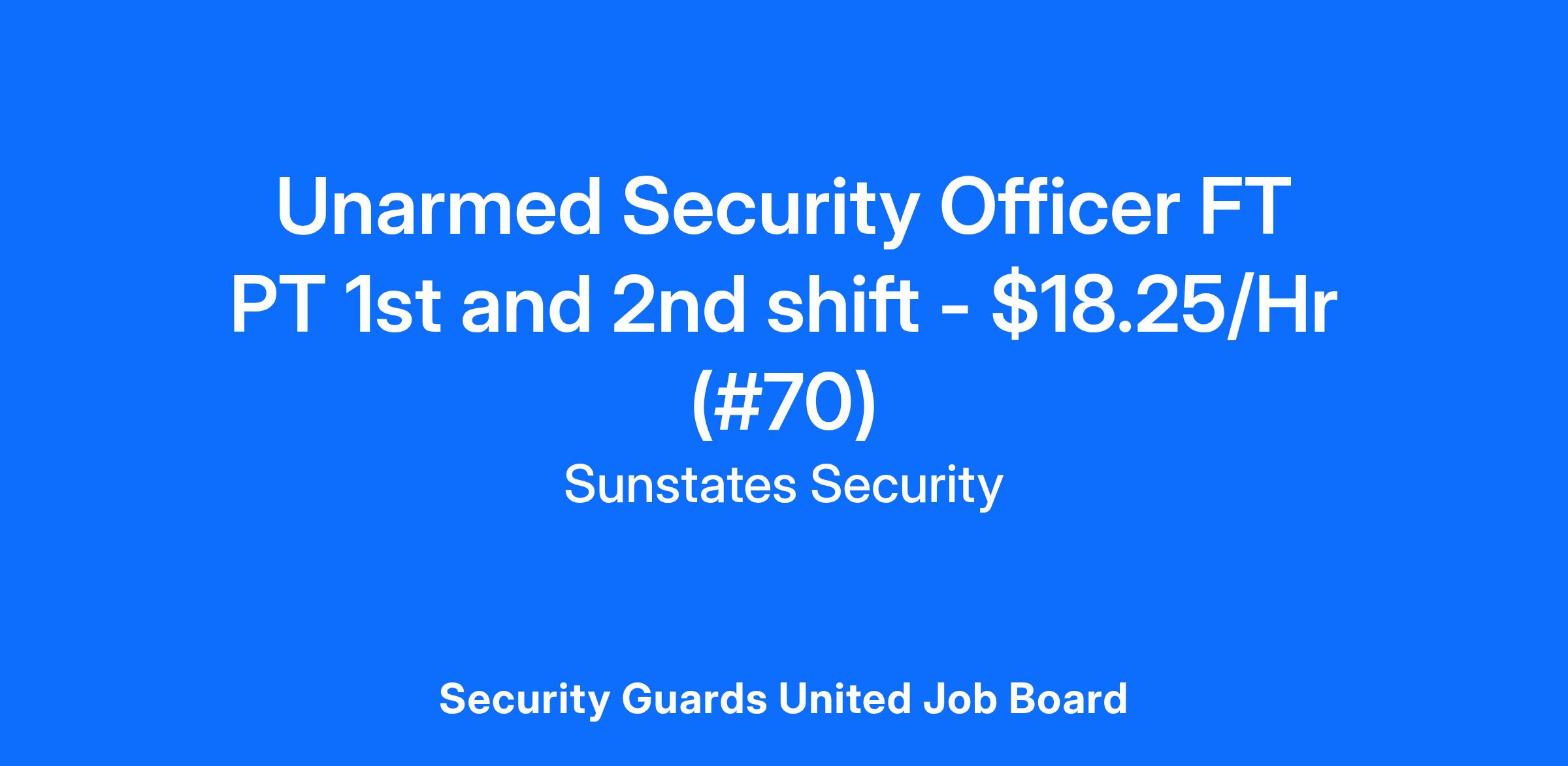Sunstates Security is currently hiring a Full-Time, Part-Time, Unarmed Security Officer in the San Antonio, TX area. These positions are for the 1st and 2nd shift, and the pay rate is $18.25/hr, paid weekly.
