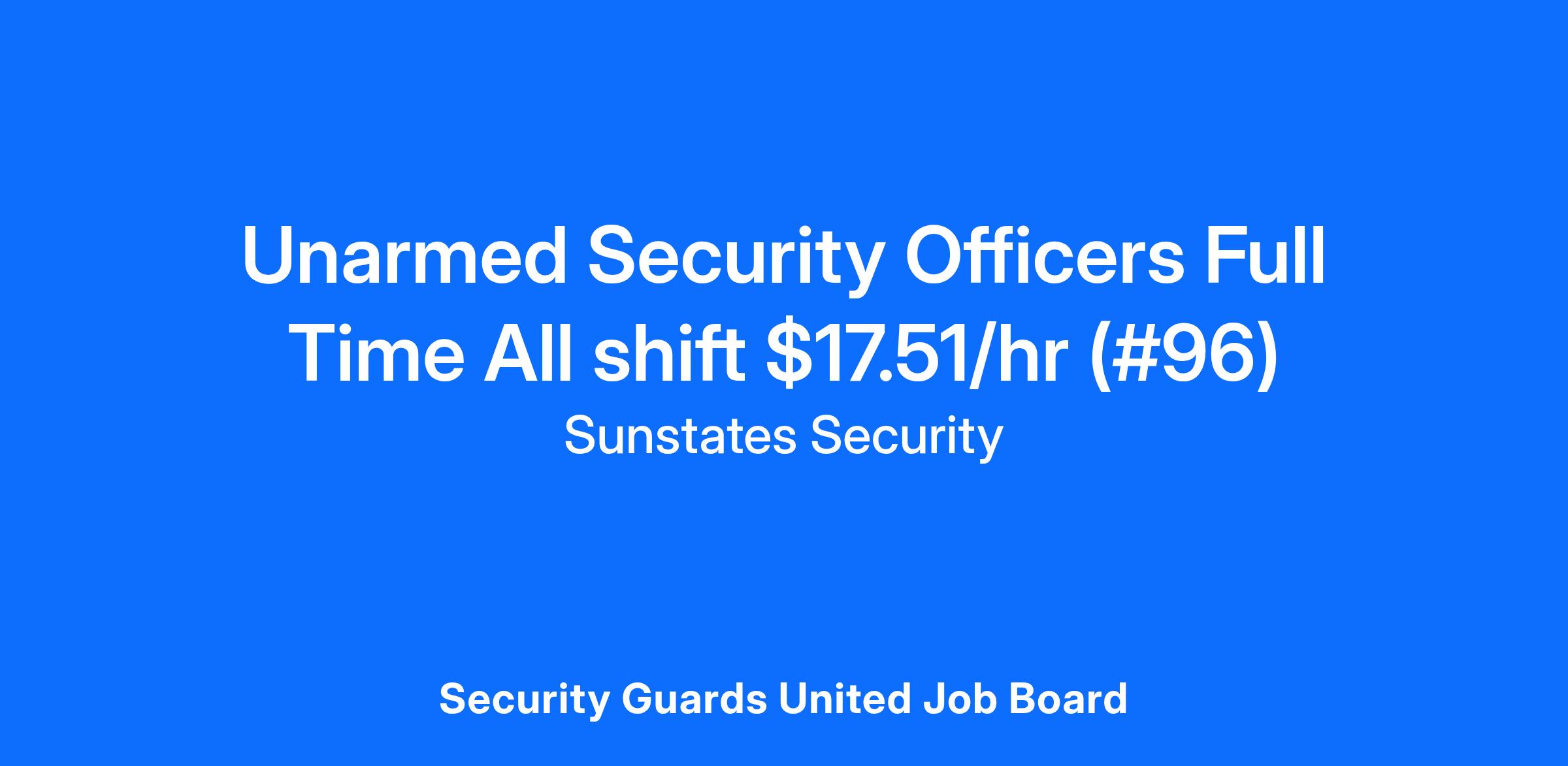 Sunstates Security is currently hiring Full-Time, Unarmed Security Officers in the Fort Worth, TX area. These positions are for All shifts, and all days of the week with a pay rate of $17.51/hr - paid weekly.